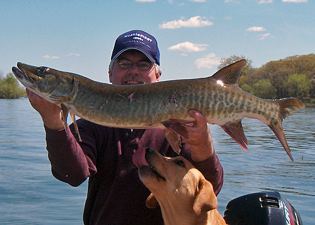 Location: Kentucky | muskylog.com - 5/26/2009 10:51 PM Very Nice!! As an avid duck hunter as well as esox angler, my dog always thinks she should be retrieving everything thing that hits the water. It makes it tough to take her out with me. Same here! Although my current dog is older (almost 8) he still doesn't fully understand fishing. Since I hunt out of my boat (jon with blind) quite a bit he associates boat rides with duck hunting. He is better, but still occasionally wants to retrieve a bait.