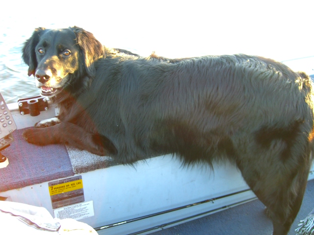 Like I said he's finally settling down---he was a NAUGHTY pup but 16 weeks of obedience classes now have his owners properly trained. He now does just great in the boat. |
