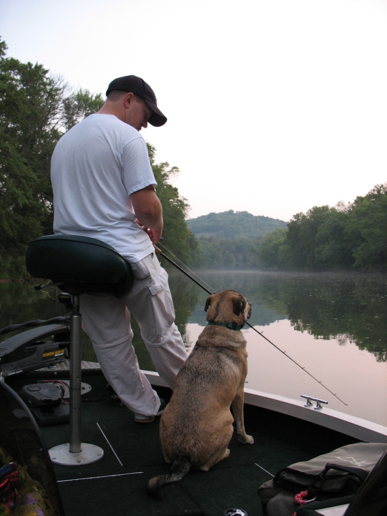 | My dog Mooch loves to go fishing. He always sits up by the trolling motor and watches me fish. He knows all the rules and has never been a problem in the boat. For some reason he is scared of the net, lol.