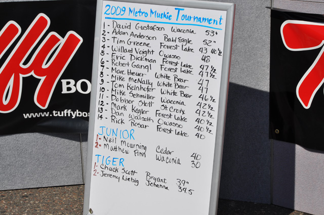| Does anyone have the complete list of all the people that caught a muskie (I belive 1-35th place), fish length and the lakes they were caught in the MAC Metro Tournament. Curious to see how the rest of the gang did after 14th place. Thanks |
