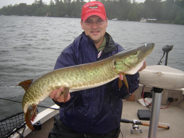 Location: Seymour, WI | I fished the WI Musky Alliance Tourney in Eagle River. We spent all our time fishing N and S Twin lakes in Phelps. This was my third musky trip to Vilas this summer and on all three trips have had strong storms, very cold weather and strong N winds. We had most of our fish action in the early morning before 8 am. I moved 5 different muskies all on surface baits and caught a 35" Fri morning. The fish jumped at least five times so even thought it was a small musky, it had me excited. My boat partner moved three different muskies all on jerkbaits including one on Sat afternoon that was upper 40's. That fish had us really pumped up, but we could not get her to go.