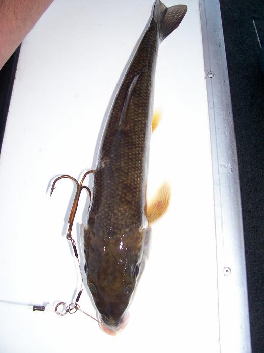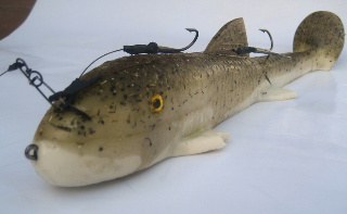 Brewcrew, as far as the single hook goes, we usally feel the fish flip the sucker and then set the hooks straight over the top of the fish. its not really designed to trail way behind the boat. it is most affective when you are able to position yourself over the top of the fish and once you feel the "Tap Tap" (the sucker being flipped) you put the screws to em. this is not a long waiting period by any means, it happens in a matter of seconds, usally no more than 30. We are not letting the musky swallow the bait by any means. I would say 90% of the muskies we have boated have been right in the upper jaw or lip. The other nice thing about one treble is that your not likely to wind up with that second treble that is usally swinging around wind up in your hand or in the gills of the fish.