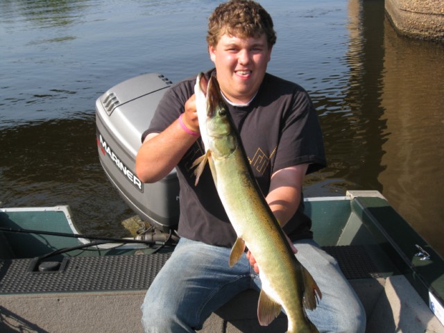 Location: Bloomer, Wi | Got this 41 on the 1st cast! I was throwing a stillwater on the chippewa river from shore, miss 2 more that morning, fog was so thick you could hardly see the topwater coming in. ( by myself, reason for poor pic)Had 2 oppertunitys last night but could convert, did land a 18" smallie on dbl 10 after dark though.