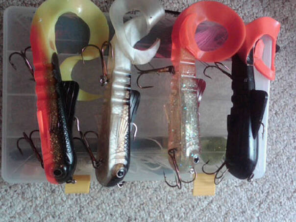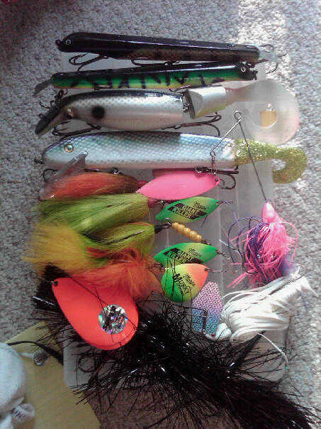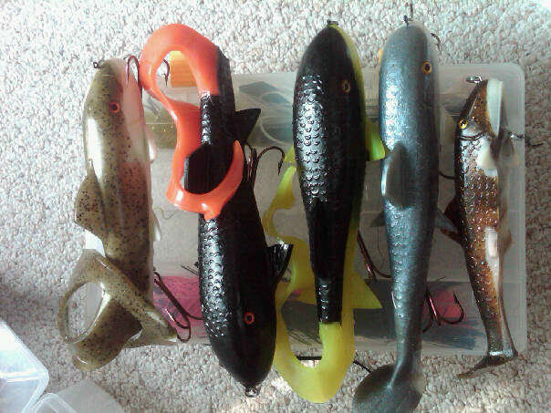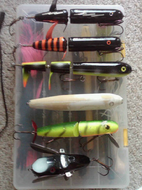 the DD, 2 DDD, 10" orange tiger, 2 tippy river darters, magic maker, 2 longer delongs, and ribbed delong, perch dawg, small sucker, and various tails