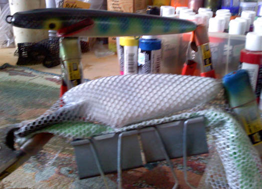| I've got 6 embroidery hoops all with a different size mesh on them. I lay the lure down on an angled board that I have pegs driven into and trap it in the mesh. I use HOK lacquers with a fast drying reducer, so I can flip the lure and do the other side usually in under a minute. A light mist like scaling dries very fast and can be handled as soon as it's dry with very little chance of any kind of smudging. |