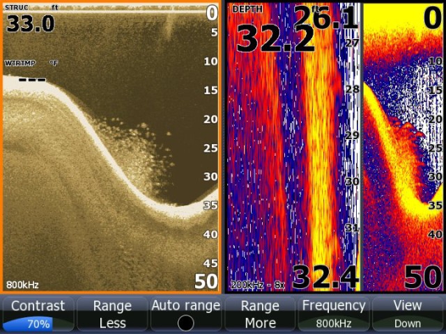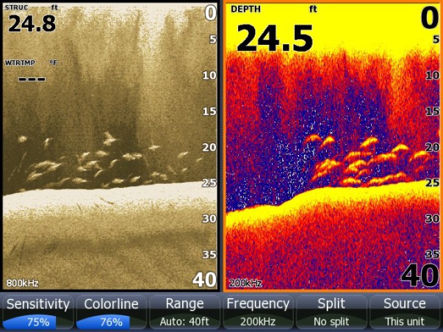 Location: Stevens Point, WI | Here are some images taken by a buddy of mine today with the HDS StructureScan and DownScan. He had the Humminbird and Lowrance side by side. The digital Lowrance showed today he said. The one image is from 70+ feet of water, with fish 60 feet down.