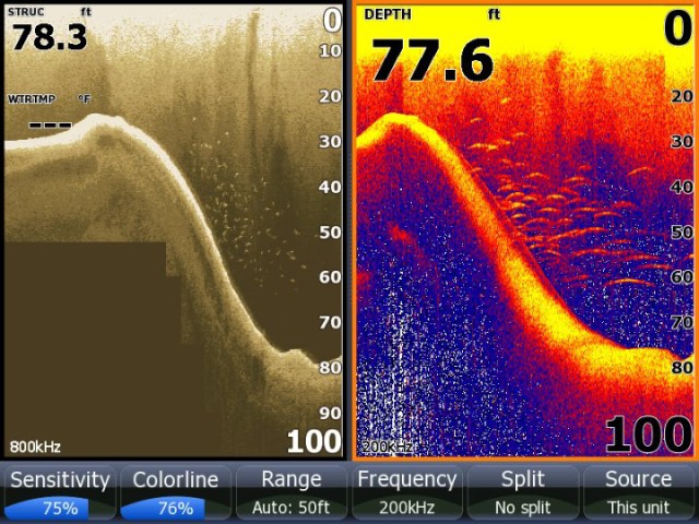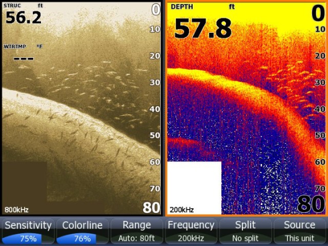 We once had a five Muskie day when the fish were suspended in 40 to 45 ft of water. The fish were suspended less than ten feet deep and the sonar spotted them along with the schools of baitfish they were chasing. Were it not for the side finder, it is very unlikely that we would have casted there and even more unlikely that we would have started throwing topwaters at that depth. Luckily the side finder was on and the screen lit up with "stackers", as we call Muskies.