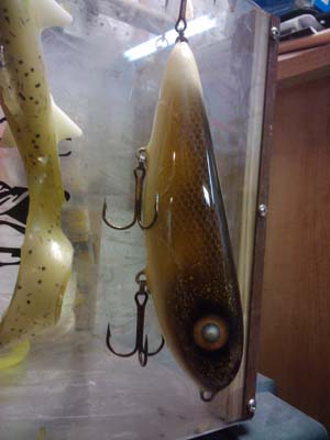 Location: North Coventry, PA | I have a True Glide topwater. I think this bait is called the Heckler. The pattern is natural walleye. This bait is used and has some hook rash and scratches, but it runs great. Bait is signed True Glide 2006.