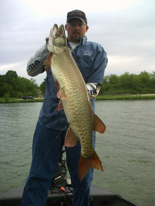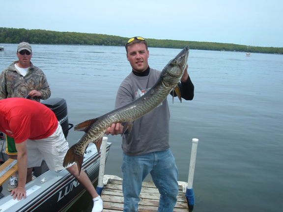 Location: Eau Claire | Partner and I won the Little Green Lake Tournament with this 43 1/4" tiger. The fish was not doing very well (only weighed about 8 or 10lbs) and unfortunately died soon after it's release. It didn't put up more than a one headshake either. Partner caught it on a Jimmy, I had 2 hits on a hellhound.