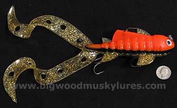| I would say to try the PK Extreme Action Swimbait. They have ridges along the body to give off extra vibration, a split tail, glow powder in the plastic and they come in 6" sizes. They work well for tiger muskies. |