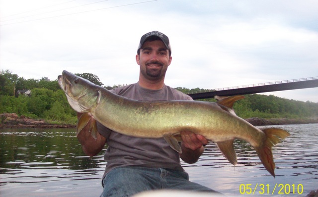 Location: Bloomer, Wi | here is a memorial day 40" musky I caught by myself on a homemade cedar topper I painted a stink pumpkin pattern, fish hit at 540 am. Had to fish from shore cuz the new trolling motor went to hell on me last night (bummer).