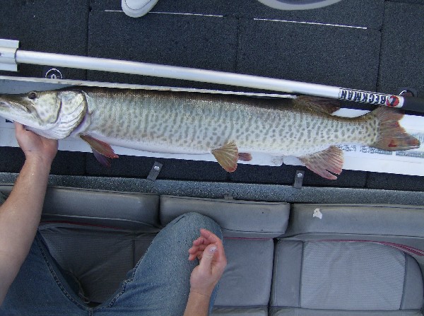| Actually it might be a Miger, not a tiger though...a strain of hybrids where the muskie is the dominant gene. A new strain that is just starting to be looked at. That might actually be the first Miger ever photographed...congrats! |