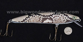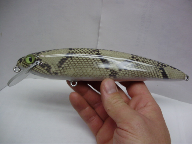 Location: South-Central VA | Kyle at Big Wood Musky Lures is going to have some of my snake skin crankbaits, Viper Minnows, at the shows. The blanks are cedar that are sealed, I used .092" 1.5" stainless eyes screws that are epoxied in, 3X stainless split rings, and VMC 9626 4X strong 5/0 hooks. The lures are finished in 6 coats of epoxy and the diving lips are held in with two .062" stainless pins. Each lure comes with a piece of the actual skin that was used on the lure. Too many guys don't believe me that the lures aren't painted. They look 'pretty' but they're built for hard fishing. The lures Big Wood Musky Lures will have are the sea snake, python, and cobra. I'm working on getting some rattlesnake skin so hopefully Kyle will have them before the show.