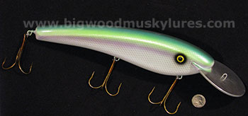 12 1/2" traditional through wire (not a bait cut in two and glued back together with a wire inside) Giant, wide metal lip that runs hard and achieves depths of over 30 ft!