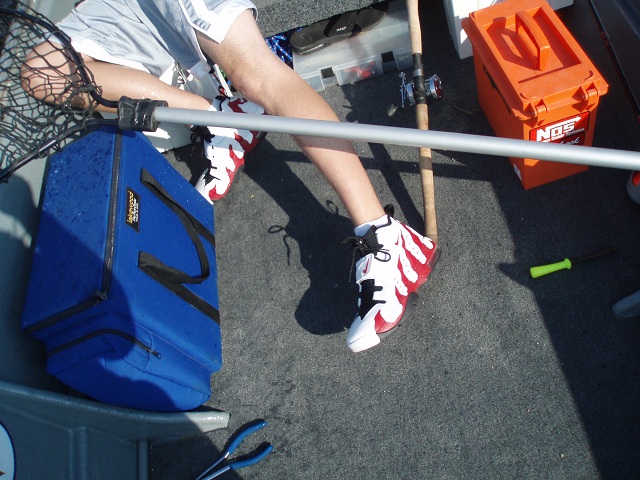 Location: where the fish are... | I fish barefoot during warm days but usually wear my nike shox, but my partner wears these straight from the mid 90's and yes they are what your thinking