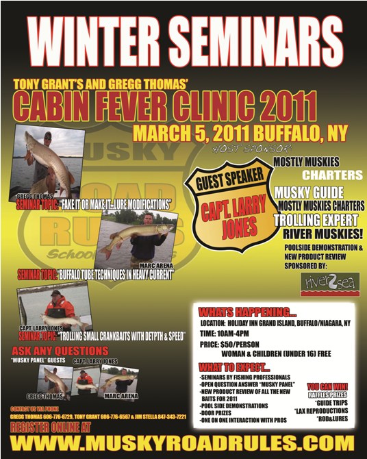 On Saturday March 5, 2011 from 10AM-4PM at the Holiday Inn Grand Island sponsored by Mostly Muskies Charters and All Esox Publications we will have Gregg Thomas discussing "How to Alter Your Approach," it is here where Gregg will show you how to modify or alter your lures or presentations to get a new look or action out of your old baits. along with Marc Arena explaining "Buffalo Tube Techniques in Heavy Current," which should be great seminar the local anglers. Next would be Capt. Larry Jones from Mostly Muskies Charters the events sponsor. He will be discussing "Big Water Trolling Techniques," these techniques have proven successful for him and his clients over his many years of guiding. Scott McKee President of the Niagara Musky Assoc. Inc. will give Detailed CPR for Muskies. These seminars will be followed by an open question panel consisting of Marc Arena, Capt. Larry Jones and Gregg Thomas. Then we will conclude the day with the "New Product Review." and Door Prize Drawings for Guide Trip & Lodging with Capt. Larry D. Jones and lots of Lures etc. For you interested this event will be followed by a lure swap that will be headed up by Capt Larry Jones. Participates can stick around for the lure swap that happens right after the event. Please contact Capt Larry if you are interested in setting up or getting involved.
