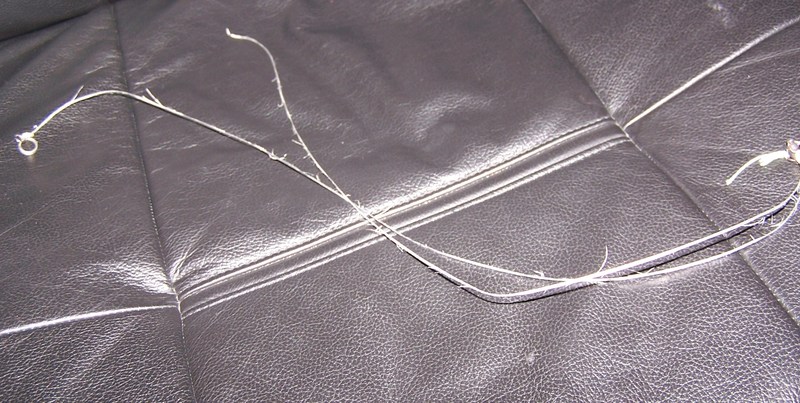 Location: Grand Rapids, MI | I used to use Flourocarbon. It was nice, because it never kinked if the front hook got wrapped around the wire. The problem with rubber swimbaits like Dawgs, fish eat it at the head 95% of the time. That puts the leader in the fish's mouth, and flourocarbon doesn't hold up well. I use 124 lb single strand. Here's a pic of a flouro leader after it went into a 45"er mouth.