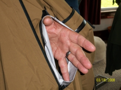 One more unmentioned portion of the feature...you can relive yourself in a downpour without getting anything except an irrelevant part of your anatomy wet and without taking off the jacket.