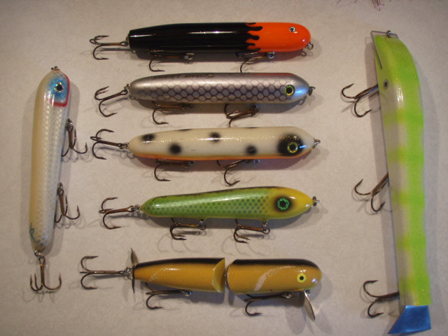Small Jerk Lot-Beaver Perka?, Big Game Woodrow painted by Mark Smith in yellow crappie, Magic Maker,2-6" Reef Hawgs, Musky Nut Tackle F.I.T. $40 Shipped