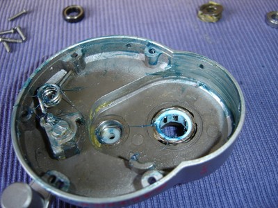 If U have alot of backlashes, take out the spool bearings and clean them with carb cleaner then soak them in Acetone, blow dry them with a hair dryer and then use Hot Sauce Grease, I will remove one of the shields and fill it with grease then replace the shield, that will slow down the spool bearings a litttle so U won't backlash as bad. Also as U can see in pic there is a plastic bushing U can replace with a 3x8x4 bearing so the reel will crank smoother, use grease in that one to.