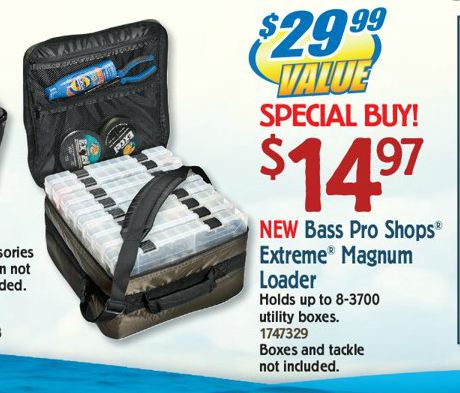 Location: PA | If you have a Bass Pro close by you might want to check these out. I looked at these bags last week at the Bass Pro in PA. Will hold up to 8 3700 boxes and has a small pocket on the outside. Nice bag for only $14.97. Not sure if the price is only good during the Spring Fishing Classic sale though.