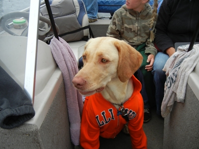 Another time a friend of a friend came into the boat with four rods. Seriously, four rods. (16 foot boat) Well the trip was fine, but upon returning to the launch, Bailey jumped out of the boat and one of his rods had a lure that hooked her in the butt. She took off, the rod broke and the hook ripped out. She went to the vet for shots, but was fine.