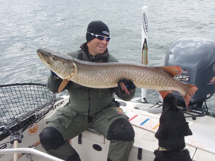 | My dog grew up in the boat. He's a fishing fool. The pic below is him chasing small male pike at ice out in front of my house. He even knows to watch for follows when I'm muskie fishing.