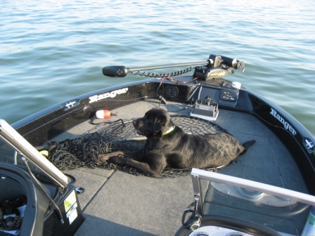 | My lab is from a very high-drive field-trial breeding...he settles pretty well in the house, and the boat is ok if we're just hanging out swimming or something, but he CANNOT lose focus on anything thrown overboard--retrieving bumper, ball or hooks. To listen to him wail while he's forced to watch from the boat, quivering with anticipation while you repeatedly toss that little funny-looking retrieving dummy tied to the pole and string overboard--and not let him retrieve--you'd think he was being beaten mercilessly. He's not a great fishing dog. |