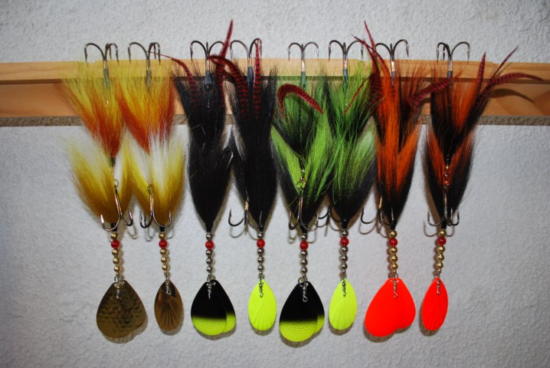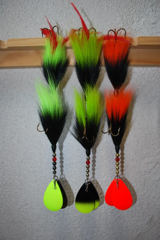 Musky mania trouble and double trouble "customized" with the bucktail replaced with flashabou or silicone |
