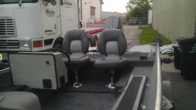 I need to get a windshield, and the front spot light is cool. I still have those plastic seat mounts on my decks. I am going to change those out because I can't find post. What is the black box in the front deck (dead center) off the floor? Looks cool. I will also be placing my 3 batteries under the front deck for my Minn Kota 101 since no one wanted it. I might be able to pull a good hole shot with my trolling motor.