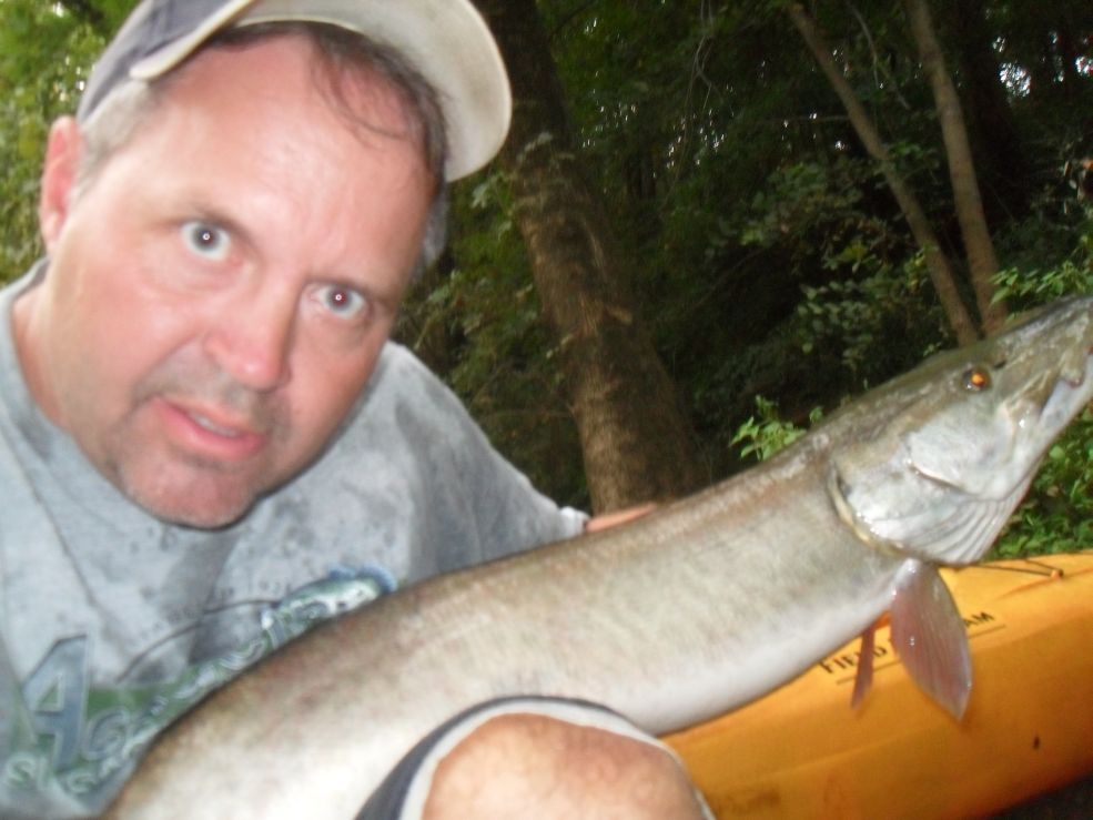 | Caught my first musky from a kayak this week. My son located a few muskies in a hole of water that was pretty much only accessable with a kayak. For the most part, fishing from the kayak was pretty aggravating. Hard to manage the net, paddle, fishing pole, baits, and my sore back and shoulder. But, when the fish hit my glide bait, it took away all of the aggravation and turned into a really good fight with a musky. He came out of the water three times and almost turned me over a few times after I got him in the net. After reading on this forum, that it is so easy to lose a musky on a manta lure, I was really afraid that he would come off, but he stayed on long enough for me to get a picture and then send him on his way. Now, I'm wanting another one from a kayak really bad...