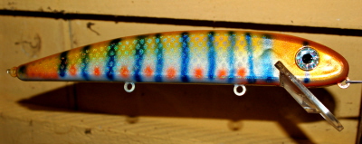 | Many of you have met my daughter Taylor at outings in Rhinelander and at Spring Bay. She missed last hockey season due to a foot fracture, and spent almost all this summer on crutches because of a reaggrivation while working out. She asked to come out to my painting room when the temps dropped, and asked if she could paint some lures. I have some "Fake Jake' bodies from ebay that are actually very good blanks and I let her have at one of them. She went through some fish books and found a salt water fish that she liked. I was impressed. Stripes, dots and scales and even her signature. She enjoyed painting it, and plans on doing more when she gets time. I'm proud of her fearless nature and will to try other things when things change. I think I heard something about custom painted helmets and sticks. We'll see how that goes.