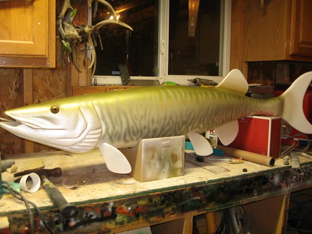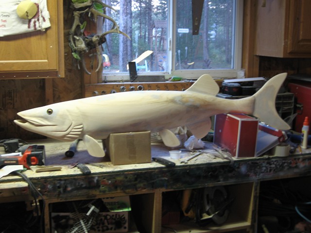 Location: Central Wisconsin | I realize this isn't a lure, but thought I would share anyways. This is a little project I have been working on for a while now. I wanted to make my own replica of a fish I caught a couple years ago. After a buddy dropped off a huge piece of old white pine at the house, I thought I'd give it a shot. I roughed the main body shape out with a chain saw, then progressed from there. The fins are attached after the fact, and doweled / puttied into place.