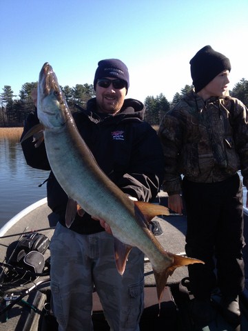 | Got out on the water this morning with my son and a good friend. Scraped the ice off the windshield of the old ford and on are way we went. We casted twitch baits and buck tails for a couple of hours and I managed to land one good muskie on a 5" Minni twitch bait made by Custom X Lures. Only fish we saw this morning and in the Frabill it went.