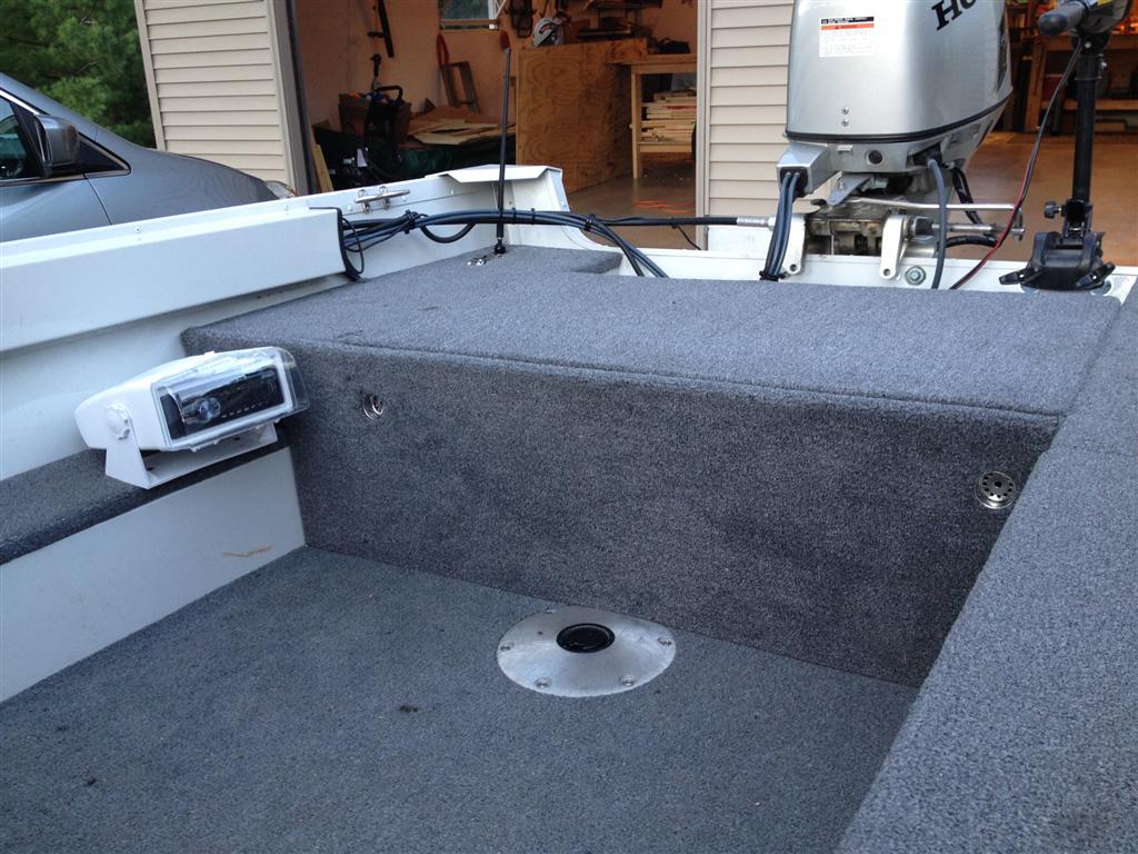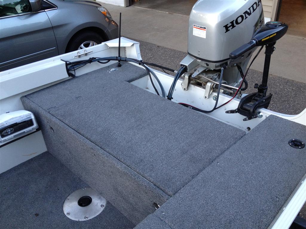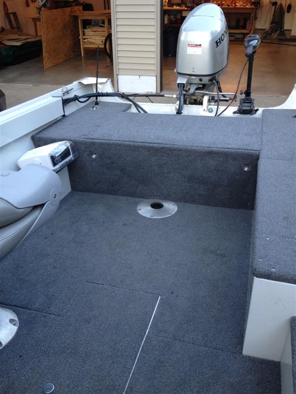 | I built mine using a similar concept to Cave Run Legend. I used standard grade plywood and just put several coats of fiberglass resin on it to seal everything. I also did away with the captains chair pedestal. I just set a seat right on the deck if I know Ill be driving a lot. Batteries, tackle boxes etc. slide right under it. I used indoor/outdoor carpeting from Menards. I think all in it was like 25 bucks to build. Its also easily removable If I need to get back there to service the bilge or if I ever sell the boat and the next owner doesn't want it. |