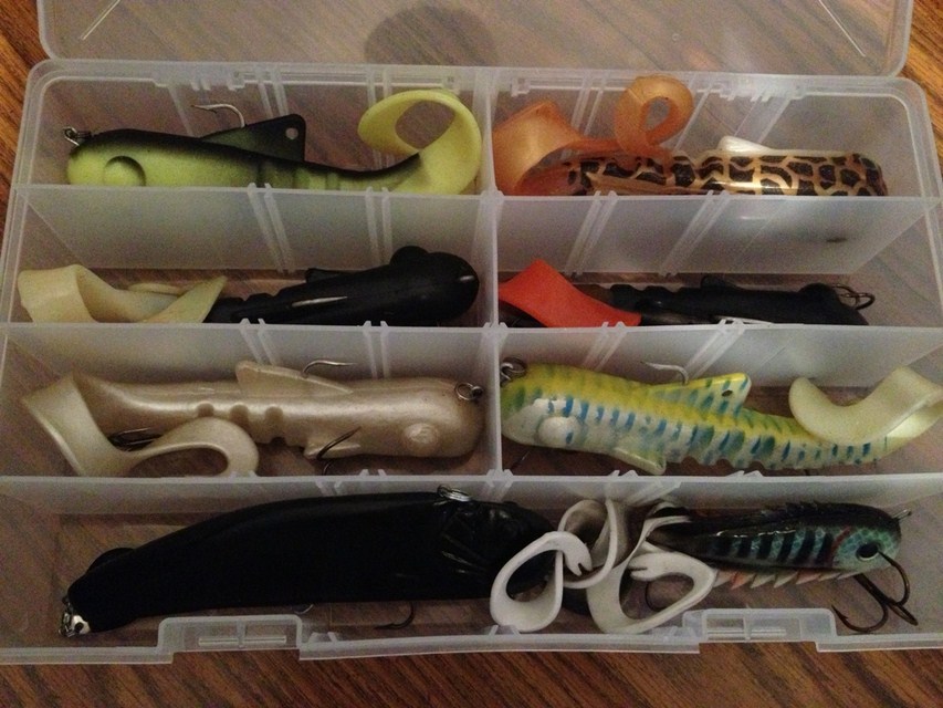 | Just Encase is awesome for hanging, but you will need a large box for a sizeable collection of Rubber. I prefer to use the Plano plastic cases. I can’t recall the number, but it is the larger plastic box without dividers. It will store 7 Pounders without issue. Funny thing about Rubber, you actually want it in the box pretty snug. That prevents the big hooks from doing damage. I’ve had color bleed issues, but nothing serious. Just don’t put the white pounder next to the firetiger. I put my smaller rubber in the 3700 series of boxes. Shadzilla type baits I hang. (they are not as bulky)