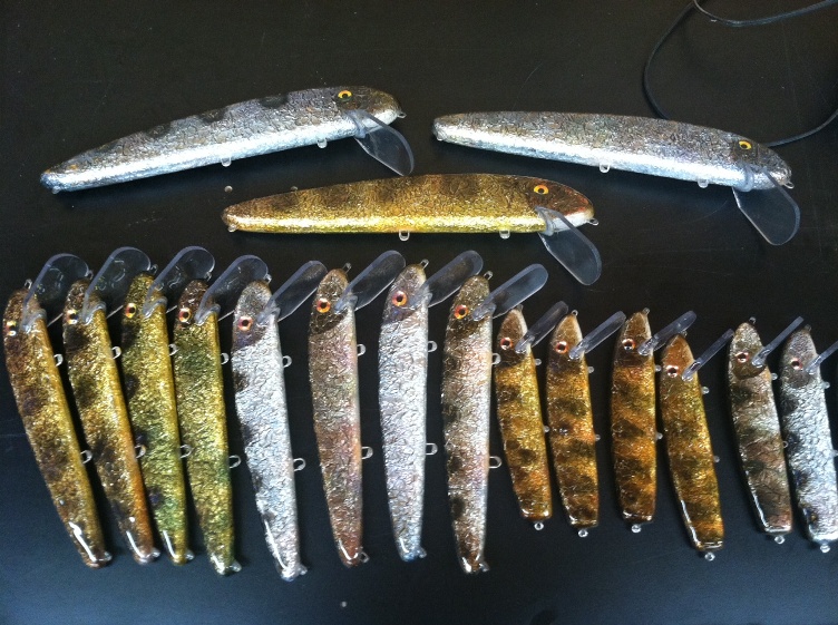 To be more specific: These are Custom X Lures that I have Jerry Podmarsky foil and paint. They are all cedar, through wire, with Wolverine split rings. When I get them back I have to but 5-6 coats of epoxy on them to cover the foil. There is a lot of work involved from both of us. the Hybrid will be 65.00, the 12" will be $70.00, and the 16" will be $90.00. Yo have to see them in person to really get all the colors that are in the paint job.