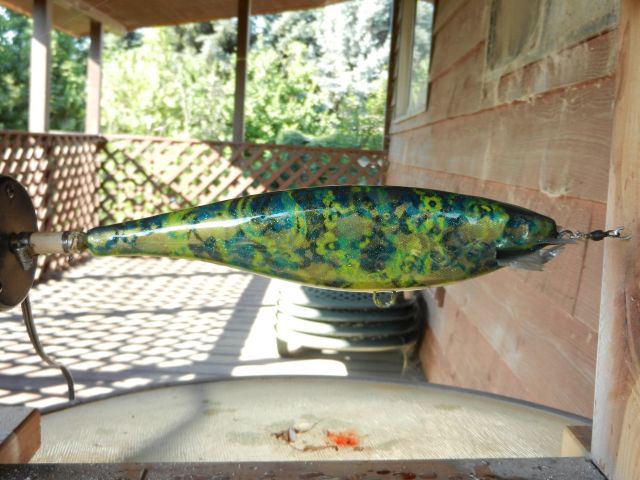 An all paint lure that evolved from (1) chartreuse/black, (2) blue, (3) gold, and finally (4) green. Three lace patterns were used that each covered roughly 1/3 the length of the lure. The patterns were rotated as each color was added.