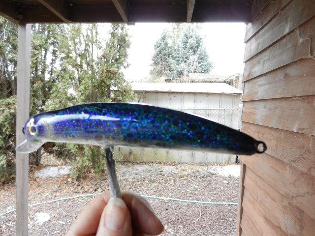 The first couple of lures were foiled with a random spot pattern applied, but neither lure displays the foil effectively. The third was an attempt to use water colors and glitter which will probably find a home in the garbage can. The last lure was an attempt to achieve a "diffuse" effect using transparent lacquers over wet epoxy. Unfortunately this batch goes into my potz-a-lure program for future reference.
