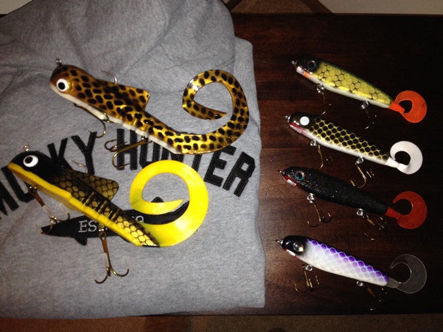3 diesels,1 mf shad and a mx9 from muskytrain, a new plastic suick, 2 custom cowgirls and 2 new twichbaits from big game. |