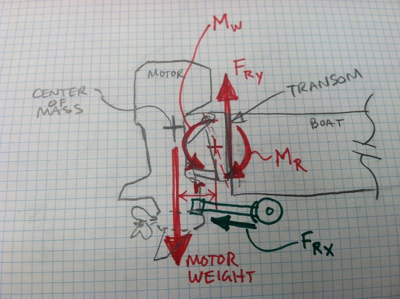 Your motor has some weight, W, which is its mass multiplied by gravitational acceleration. It's usually a few hundred pounds, say 500 LB. The motor's weight "acts" downward at some "moment arm", or horizontal distance away from the plane of the transom, shown as 'r' (in my sketch). Multiply W x r and you get a "moment (M)" that has to be "resolved" in the transom. So the transom supplies a "reaction force (FRy)" upward and a "reaction moment (MR)" to support the motor. This is all shown in red. The moment is what can kill the transom.