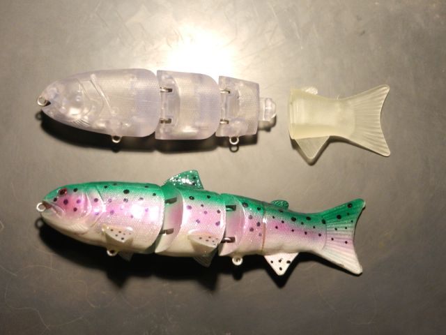 Location: Moses Lake, WA | This swimbait lureblank that combines a hard plastic body with a soft plastic tail that is going to require the same paint for continuity is the devil's own invention. I found some Spike-It material called SB3000 clear coat for coating soft plastic but it ships as a hazardous material and that costs a baby fortune, so I just coated the tail with two coats of a polyacrylic sealer and then topped it with EX88 epoxy.