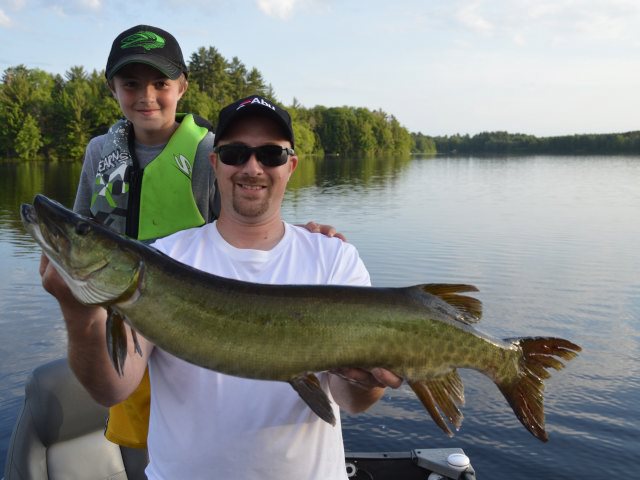 First fish in the boat for dad and I during the Tuesday night Muskie League. Great one to start the year off with. We sure do like fishing the league and socializing with everyone at Gerrits Lake View Inn afterwords. Im sure we will miss a few weeks due to work. But when we are here it forces us to stop working and get out on the water one night a week with my son Cole and that's whats counts. Cole had a muskie up in the first few casts and lost a nice pike later on. Other than the unbelievable amount of bugs on the water right now our first night of league was a good one.