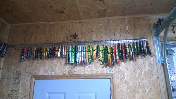 Location: oswego, il | Over the weekend I put up 16 more feet of L bracket on the wall to hang lures bring the total to to around 56 feet. Just for example I have just over 100 glide baits. I have 30 Hughes rivers. I have 13 teek neeks. I have even counted how many tr twitchers, Bagley monster shade I have but its up there. I am approaching 800 lures. Yes I have a problem. I know I am not the only one. |