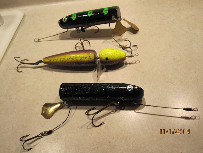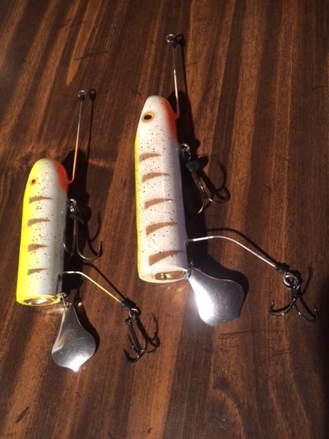 A video of my 3 custom topwaters. Turn up the volume. Some unique sounds! Headbanger ran first. Flaptail 2nd. And 3rd: custom dbl flaptail I revisited after originally built back in "92" . Caught some nice fish on this bait, but looks were alot to be desired. The blades don't really flip out of the water like the single, but clash into each other to put out some strange sonics. The 3 baits I used in the video: http://www.youtube.com/watch?v=bl-vEUBEjPQ You Like? Your thoughts?