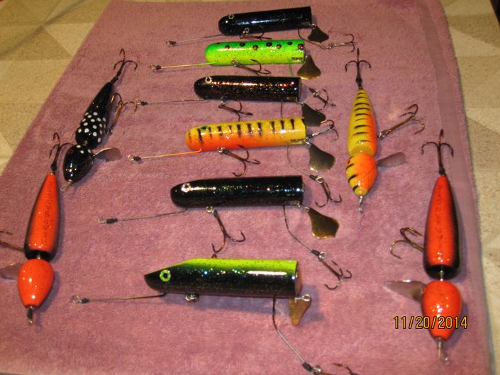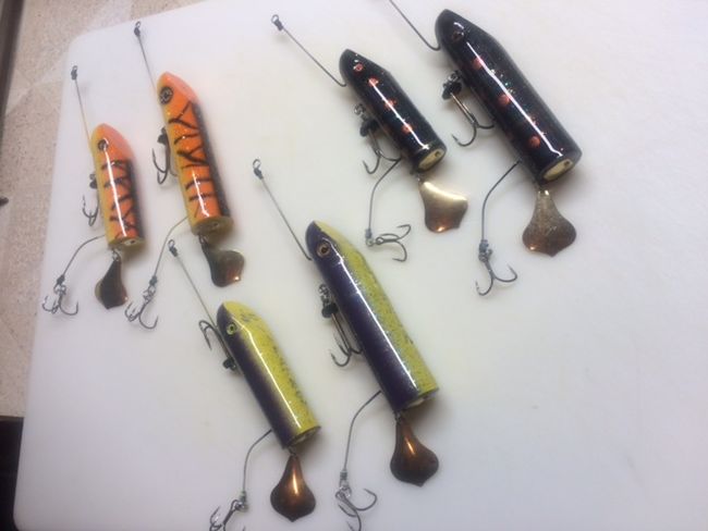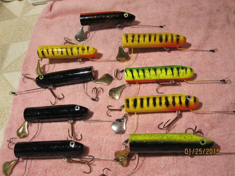 Location: SE, WI. | Thanks Gerry and Nick......JUST: Finished a half dozen Headbangers. The 2 in the middle are a smaller diameter, which should result in better hookups. Same great POP as the original size. I will call them the Mini's, but are very similar in length. IMO, many topwater baits today are way too FAT, and hookups are reduced due to, too large of a body diameter. JD