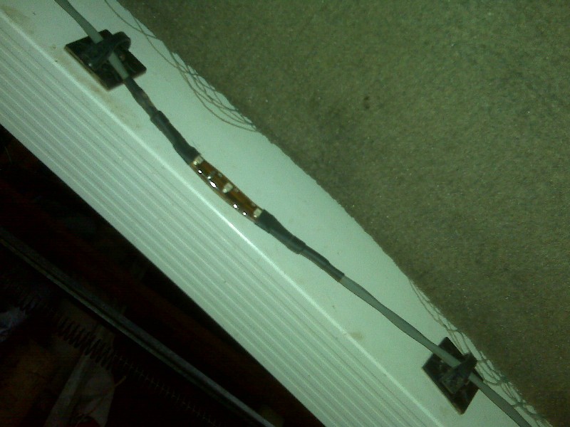Photo is of the underside of the gunnel showing adhesive backed LED segment wired in (shrink tube on either side), as well as adhesive backed wire tie holders to support the wire that runs around the boat.