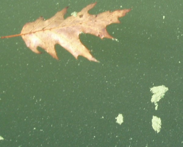 This stuff is particulate dispersion from the many chimneys in the state. Uhm, don't drink the water. If you look very closely you can see a two headed fish under the leaf. Oooohhhwweeeeee, sure glad I don't live there.  |