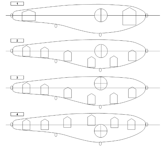 Posts: 392 Location: KY | Good question Jed It seems most people on this board hold there cards close to their chest. I wish more where willing to share their knowledge openly. I will take a stab at your question. I have been thinking about the same thing for a while. Let me qualify my answer first. I am a novice builder and have never thrown an HR glider. I have a couple dozen gliders from other makers and have made a handful of my own. Please don’t slam me too hard. Let me know if you think I am wrong though. I have inserted a picture for reference. I hope it is clear. “The "old method" where a series of small weights are placed very low on the lure while others just have one large weight in the front and back.” #1 and #2 represent the two methods you describe. My experience tells me there is little difference between the two. Notice the center of buoyancy is the same for both. Engineer types will talk about moment arms where mass further from center is harder to turn. I don’t buy into that for a glider. It is my opinion that water exerts a larger force on the lure in this case making the difference in moment arm negligible. I think they would walk-the-dog the same. Now to further the discussion. Consider #3 and #4. For #3 the amount of lead and the distribution along the bottom of the lure cause the center of buoyancy to be above the center of mass on the glider. I predict this lure would have a high degree of stability, but would not roll when pulled or wobble on the drop. #4 has lead distributed above the center of buoyancy. It would flip upside down without hooks. Lets say the hooks bring the center of buoyancy back to the center of mass. I predict this lure would be very lively, would roll when pulled, and have a nice wobble on the drop. What do you think? Thanks, Bruce Attachments ---------------- GB.jpg (73KB - 877 downloads) | ||