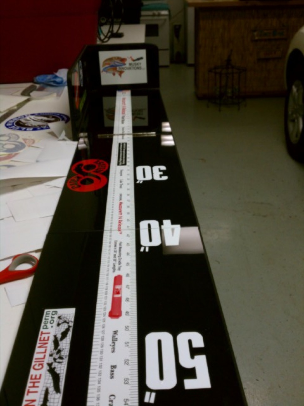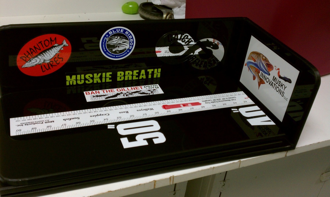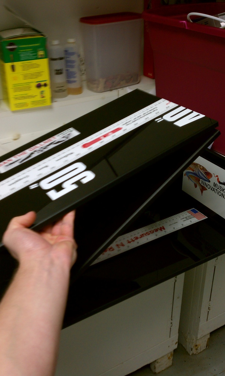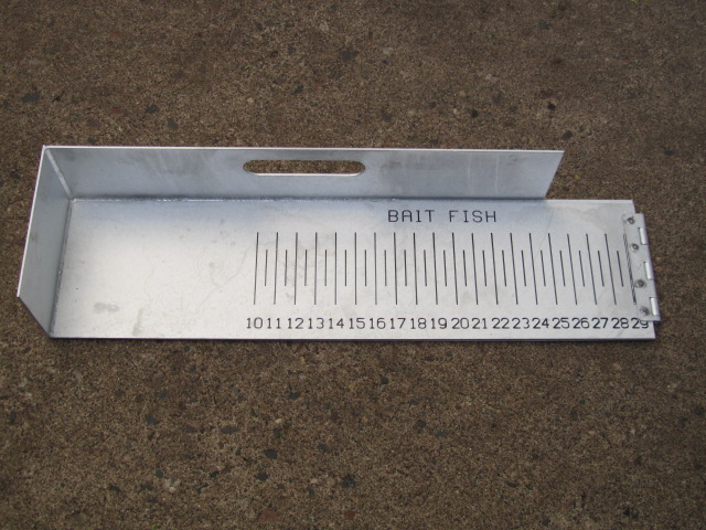 | My word of advice to anyone building one for the first time, or building another one.....compare your ruler to a Stanley tape measure or something you know is accurate. When I stared the R&D stages of building mine, I bought a sticker tape first and it was off, big time. Bought another of a different brand, and same thing. Finally went with a cloth sewing tape like you might use for girthing. I like my final product. It folds, has the hinge right about at 30", which was kinda dumb......since I walleye fish before muskies open. Have to use my other metal ruler that is screwed to my deck for big 'eyes. I think that one maxes at 40". Anyway, was going to go with cedar, and didn't. Think I would next time, since cedar lasts forever, even when wet. Which will happen when you take a chip out of your bump board clearcoat. If you do use the cloth tape method, I'd get some tiny SS nails and nail the cloth tape in place first, checking it for accuracy with a known-to-be accurate measuring device of some sort. As you nail it down, I'd have your epoxy or whatever clearcoat ready and handy. Brush some of the clearcoat BEHIND the cloth tape. As in, between it and the wood. Otherwise you'll get big air bubbles behind the tape. I think the brand I used was Bondo, believe its made by 3M. Got it at Fleet. Make sure you use PLENTY of hardener. Even go a little strong on it. Otherwise it takes forever to set up and may always be just a little tacky if you're too light on your mixture. Good Saturday afternoon project out in the man cave listening to a baseball game with the wood stove crankin'. That crap is really smelly. NOT an inside the house job. -Eric | |||